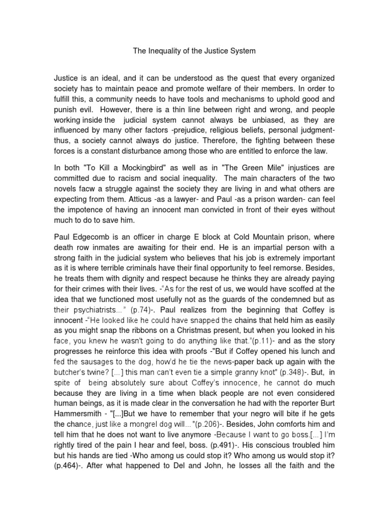 She is attempting to comprehend racism, but since she does not see the world in that way, she is having a hard time figuring it all out. Despite the fact that Bob is actually the one who beat his own daughter, to kill a mockingbird justice essay, he refuses to let go of the fact that Atticus defended Tom; losing the trial would have meant that Bob lost to a black man, which would mean he is a disgrace from society.